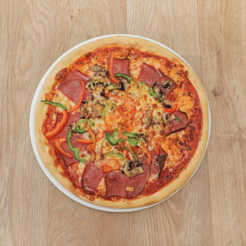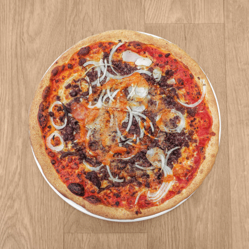 Huisgemaakt pizzadeeg, tomatensaus, kaas, ham, salami, uien, gehakt en paprika