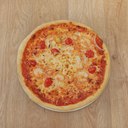 Huisgemaakt pizzadeeg, tomatensaus, kaas, verse tomaat, gamba's, uien en verse knoflook
