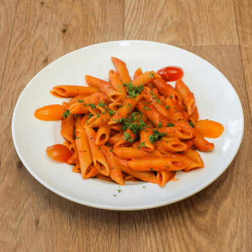 Huisgemaakt pizzadeeg, tomatensaus, kaas, verse cherry tomaten, buffelmozzarella en kaas