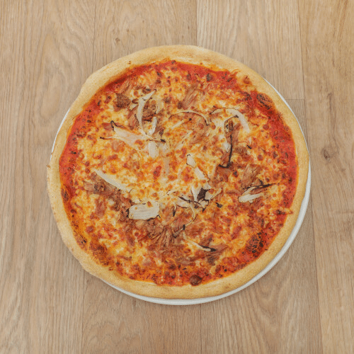 Huisgemaakt pizzadeeg, tomatensaus, kaas en kipfilet